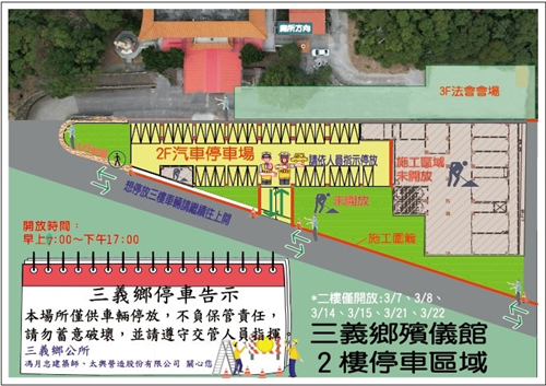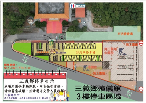 殯儀館3樓停車場:115年3月4日起至115年4月6日止,每天早上7點至下午5點,供民眾停車。